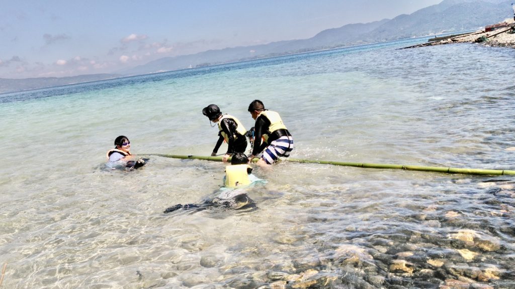 また、ある子は、みんなが楽しめる様に海で竹に細工をして、捕まえた魚を入れられる様にして、みんなで竹を海に浮かべて遊んでいました。