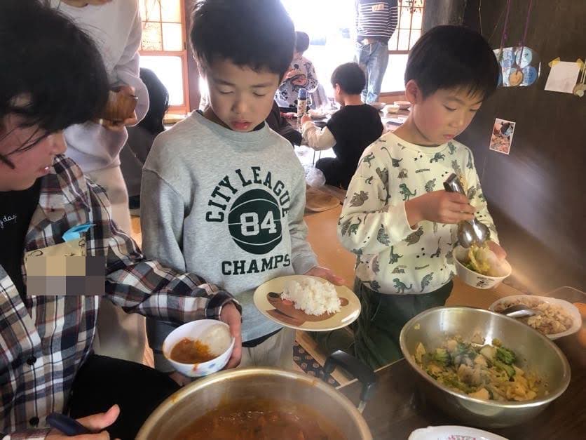 かえるのがっこうでは、食事は各自が食べれるだけつぐ形でやっています。