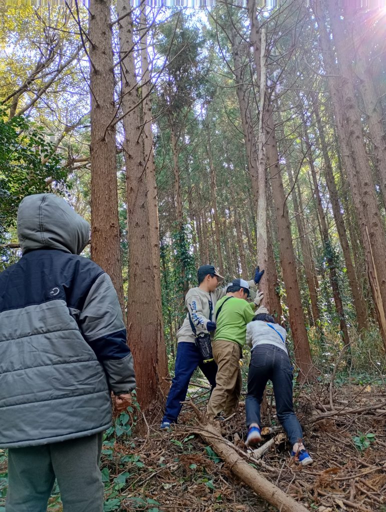 他にも、日が当たらず立ち枯れした杉の木を倒して遊んだり、