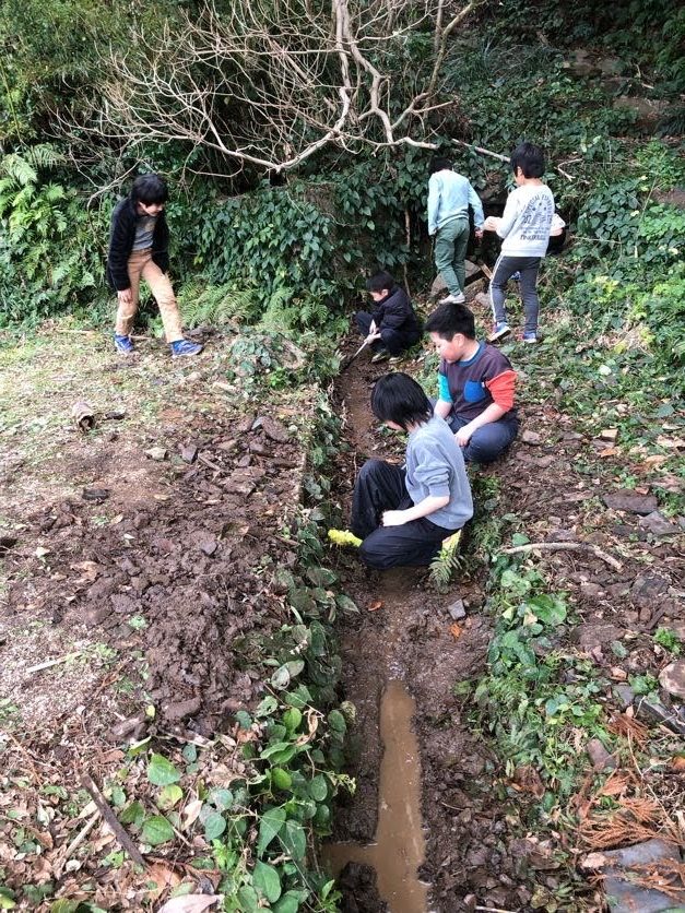 と言いながら、ツルハシのような形の木の枝で小川を掘る仕草をする子。